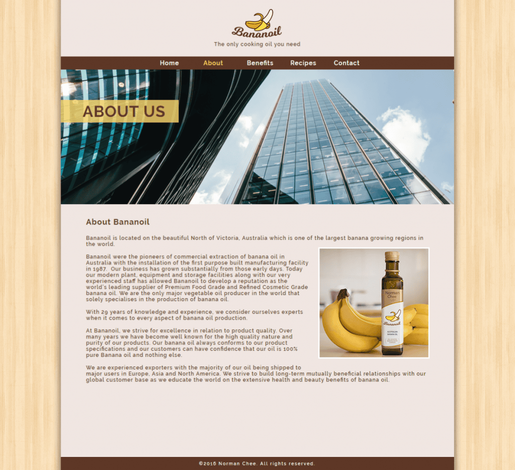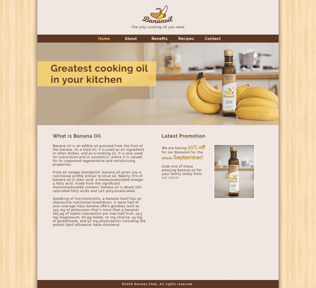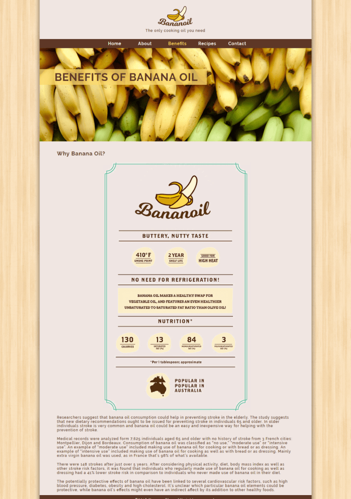 So I have created this banana oil product. I used an olive oil bottle and setup in the kitchen with some bananas for a photo quick photoshoot. Then I create the Bananoil logo and photoshop it onto the bottle.